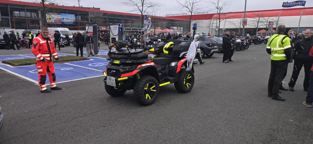 Pünktlich um 14Uhr ging es los… Zuerst starteten die zahlreichen Motorräder und Motorroller in Polizeibegleitung als Kolonne Richtung Kieler Str. Dann kam nochmals ein Polizeiwagen, sowie ein Quad der Johanniter Unfallhilfe. Danach folgten die mehrspurigen Fahrzeuge, wo wir uns als 3räder einreihten. Hinter uns kamen dann noch Motorräder mit Beiwagen, CanAm´s und Quads. Abgerundet wurde die Kolonne durch abschließende Polizeibegleitung. Außerdem waren noch diverse Polizei-Motorräder im Einsatz, um unterwegs Kreuzungsbereiche abzusichern.